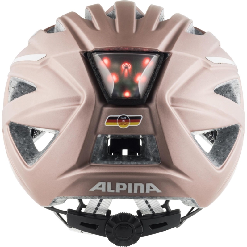 Cyklistická helma Alpina Haga má na zadní straně integrovanou odnímací blikačku, bezpečnostní reflexní prvky po stranách a také reflexní nití prošité popruhy přilby. Ideální přilba do města a ne jen tam.