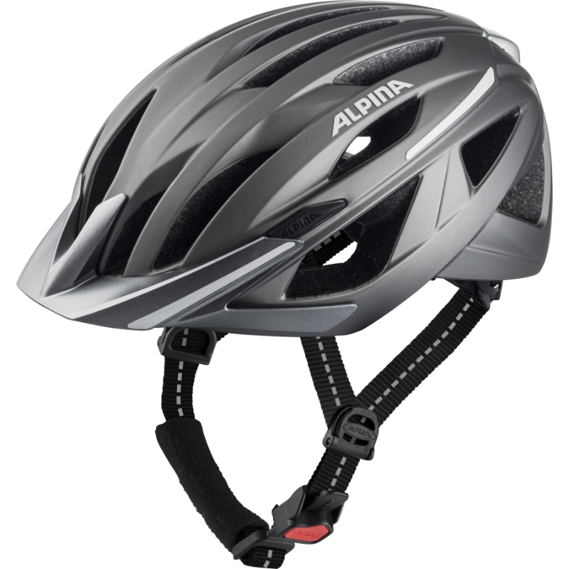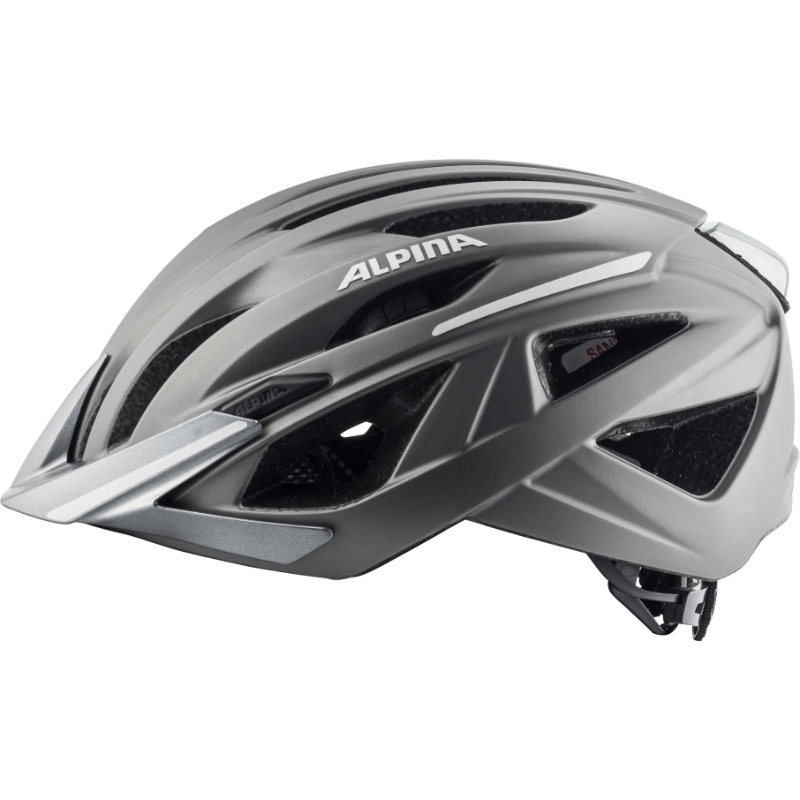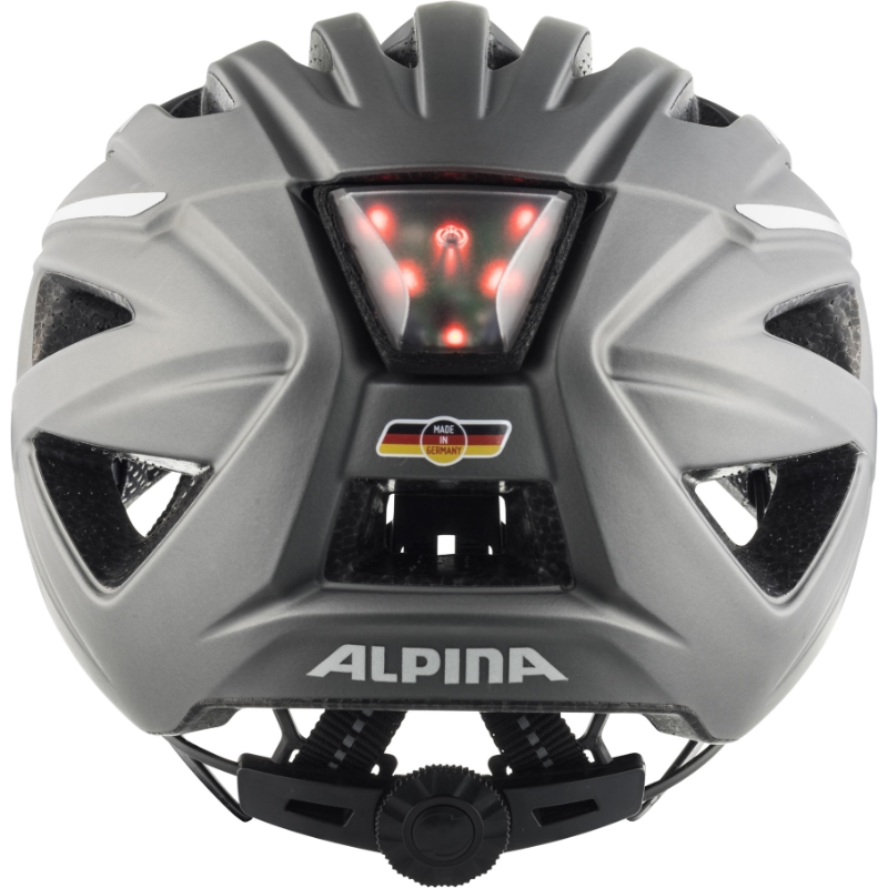 Cyklistická helma Alpina Haga má na zadní straně integrovanou odnímací blikačku, bezpečnostní reflexní prvky po stranách a také reflexní nití prošité popruhy přilby. Ideální přilba do města a ne jen tam.
