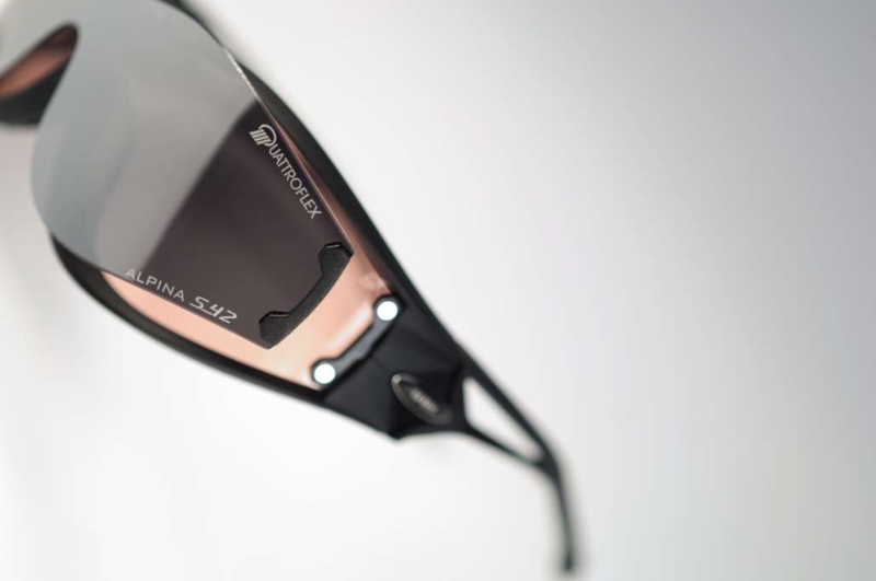 Sportovní brýle Alpina S32 DLQ Mag s magnetickým uchycením zorníků. Jsou to univerzální sportovní brýle, které mají dvoje zorníky. Základní rubínově červený zorník obsahuje 100% UV ochranu včetně polarizačního filtru Quattroflex (tlumí nepříjemné odražené světlo např. od sněhu, vodní plochy, mokré silnice...). Brýle s tímto zorníkem je možné používat za mlhy, při oblačné obloze a také i za mírného slunečního svitu. Druhý zorník, který je součástí balení, je tmavý a používá se za přímého slunečního svitu. Ten je velmi lehce odnímatelný a u tohoto modelu je uchycený pomocí čtyř magnetů (viz obrázek). Uchycení je velmi pevné. ALPINA tento systém používá u svých lyžařských brýlí vyšších cenových kategorií. Pro komfortnější usazení mají brýle seřizovatelné nožičky, jejichž spojení se zorníky zajišťují nastavitelné klouby. Tím je možné obroučky zorníků nastavit až do osmi poloh. Koncovky nožiček brýlí jsou z tvarovatelného materiálu, které je možné ohýbat a tím je ještě lépe zafixovat na hlavě. Pro modely S32 a S42 je možné dokoupit elastickou pásku (viz vlevo sekce "příslušenství Alpina") a tu vyměnit za nožičky.